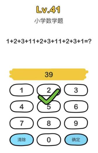 这道题目但看题目可能大家不知道具体怎么回事,但是想想小学生写字,就会发现,这是一道被截断的题目,合成一个完整的数学题目是:1+2+3+11+2+3+11+2+3+1=39。