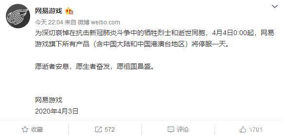 不到4分钟,网易游戏也宣布停服,“为深切哀悼在抗击新冠肺炎斗争中的牺牲烈士和逝世同胞,4月4日0:00起,网易游戏旗下所有产品(含中国大陆和中国港澳台地区)将停服一天。