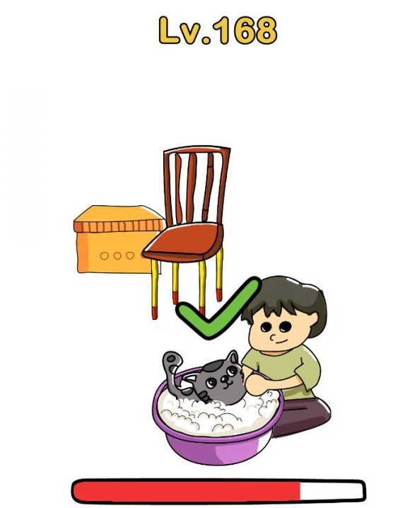 正确答案:这一关前边大家都知道,需要在盆里放沐浴露,放猫猫,关键在于一点,需要拿到椅子后方的小鱼干给猫猫,速度要快,不然猫猫可能就跑掉了。
