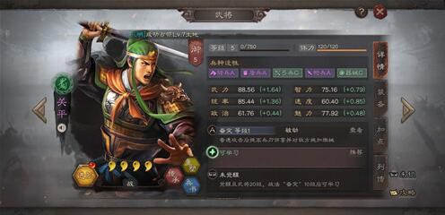 另外关平在游戏中的自带技能和这个武将也不配,奋突是根据普通来叠技能伤害的,另外还有把敌人缴械的几率,但是关平在游戏中输出又不够,只能作为辅助武将来使用,带上奋突并不能发挥最好的效果,何况本来也不强。