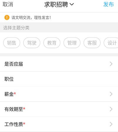 2、进入发布页面之后点击顶部的版块,就可以进入版块选择页面,在里面找到求职招聘;