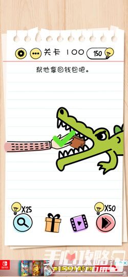 答案:用两手指按住鳄鱼的嘴,然后一个手指按住手拖动拿到钱包