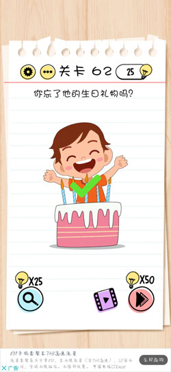 谜题急转弯Brain Test是一款充满趣味和挑战性的脑洞游戏,这里有许多谁也说不出答案的脑筋急转弯,放大你的脑洞,不要局限在题目的问题,也行文字和图片就是陷阱,那么谜题急转弯Brain Test第62关怎么通关?快和小编一起来看看这篇你忘了他的生日礼物吗通关答案一览,相信看完大家对谜题急转弯Brain Test会有新的认识。