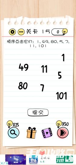 第15关顺序点击它们:1、49、80、5、7、11、101攻略