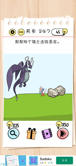 谜题急转弯Brain Test是一款充满趣味和挑战性的脑洞游戏,这里有许多谁也说不出答案的脑筋急转弯,放大你的脑洞,不要局限在题目的问题,也行文字和图片就是陷阱,那么谜题急转弯Brain Test第247关怎么通关?快和小编一起来看看这篇帮帮那个骑士击败恶龙通关答案一览,相信能帮助大家了解。