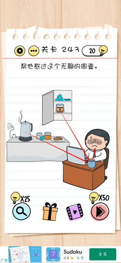 谜题急转弯Brain Test是一款充满趣味和挑战性的脑洞游戏,这里有许多谁也说不出答案的脑筋急转弯,放大你的脑洞,不要局限在题目的问题,也行文字和图片就是陷阱,那么谜题急转弯Brain Test第243关怎么通关?这里小编就给大家带来帮他熬过这个无聊的周壹通关答案一览,希望能作为玩家的参考。