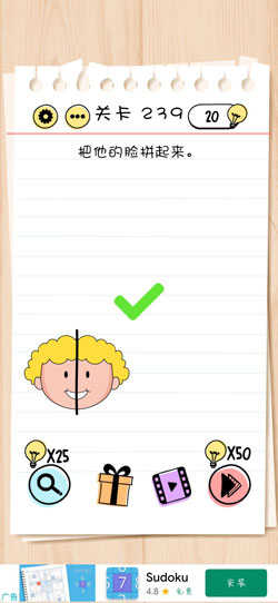 谜题急转弯Brain Test是一款充满趣味和挑战性的脑洞游戏,这里有许多谁也说不出答案的脑筋急转弯,放大你的脑洞,不要局限在题目的问题,也行文字和图片就是陷阱,那么谜题急转弯Brain Test第239关怎么通关?那么下面就给大家带来把他的脸拼起来通关答案一览,感兴趣的玩家朋友们千万不要错过。