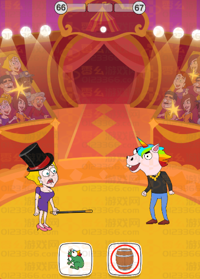 3、场景1小姐姐的表演对象是马面男,选择木桶将他困住。