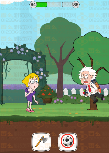 4、场景二白发博士又挂在了树上,选择足球把他踢下来。