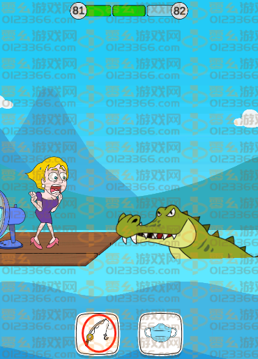 5、场景三小姐姐飘到湖中以后碰到了鳄鱼,这时选择钓鱼竿让鳄鱼显出原形。
