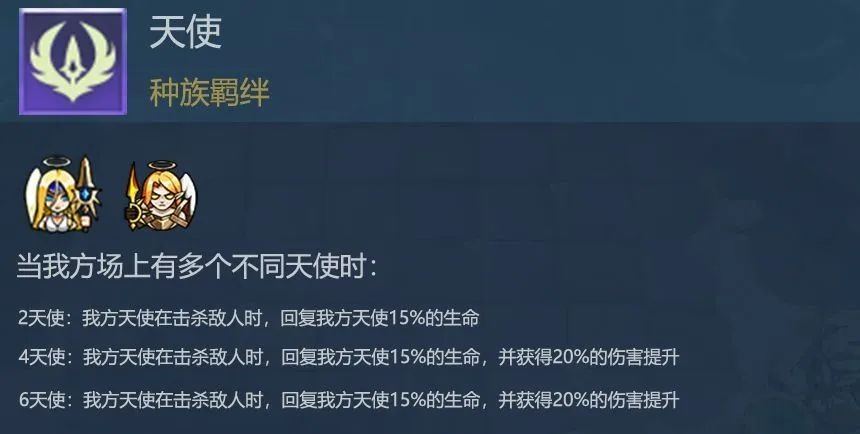如果场上有两个天使击杀了敌人可以恢复15%的生命值,如果有四个天使击杀了敌人不但能恢复15%的生命值还可以提升20%的伤害,最后如果有六个天使击杀了敌人效果和四个天使是一样的。