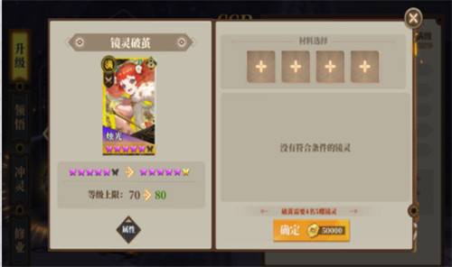 1、基础的,镜灵的等级需要达到要求,否则不可解锁破茧机制,即:镜灵的等级需要来到70级,如此才能五碟升六蝶;