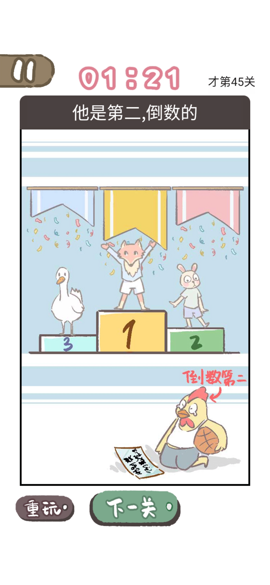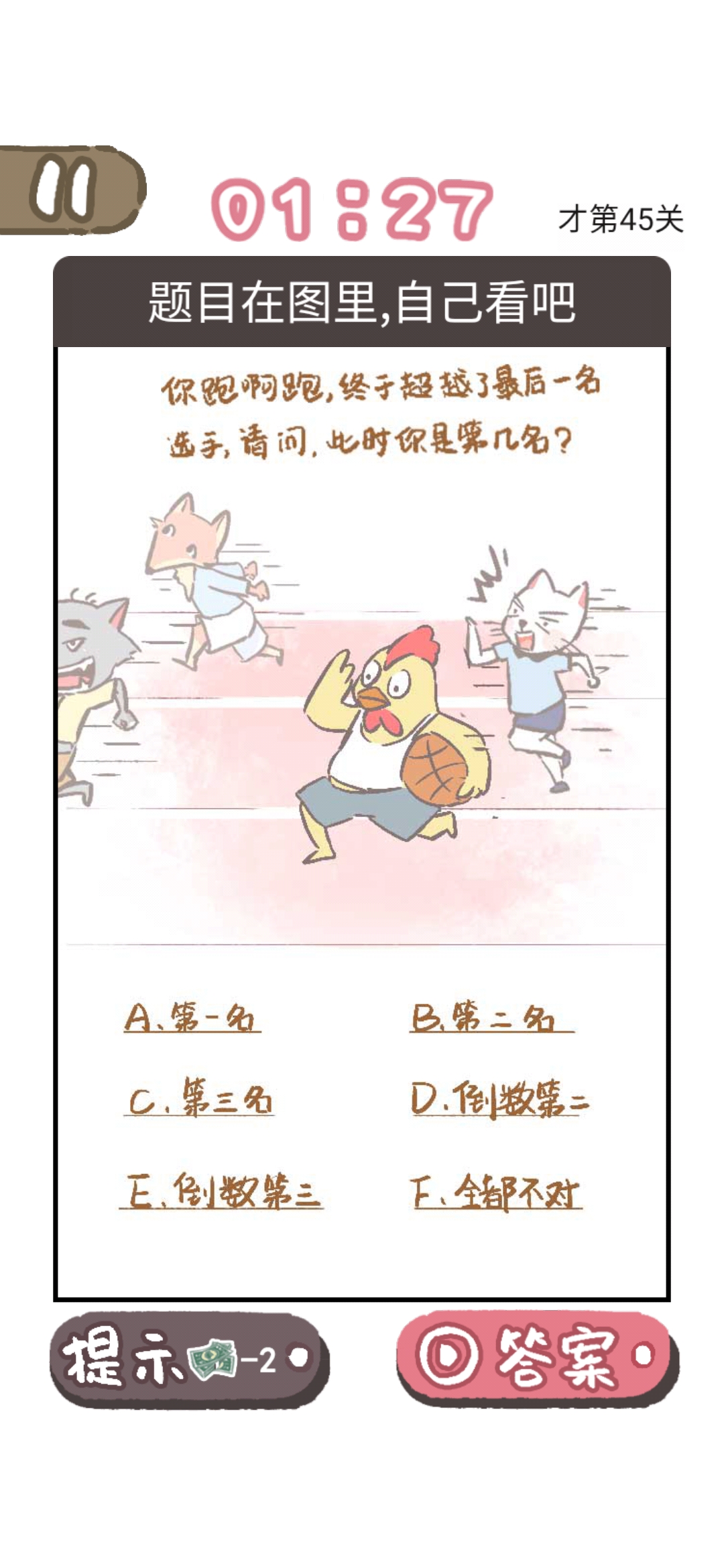 我太难了老铁是一款网络用语改编的大脑洞手游,在游戏中玩家会遇到许多的谜题,这些谜题的答案跟生活紧密相连,不仅要脑洞够大,思路清晰,还要知道需要梗,也能够考验玩家的细心程度,超多有趣的游戏关卡等你来挑战,带你感受游戏的畅快体验,那么我太难了老铁第45关怎么过?那么下面就给大家带来你跑啊跑终于超越了最后一名选手请问此时你是第几名快速通关攻略一览,感兴趣的玩家朋友们千万不要错过。