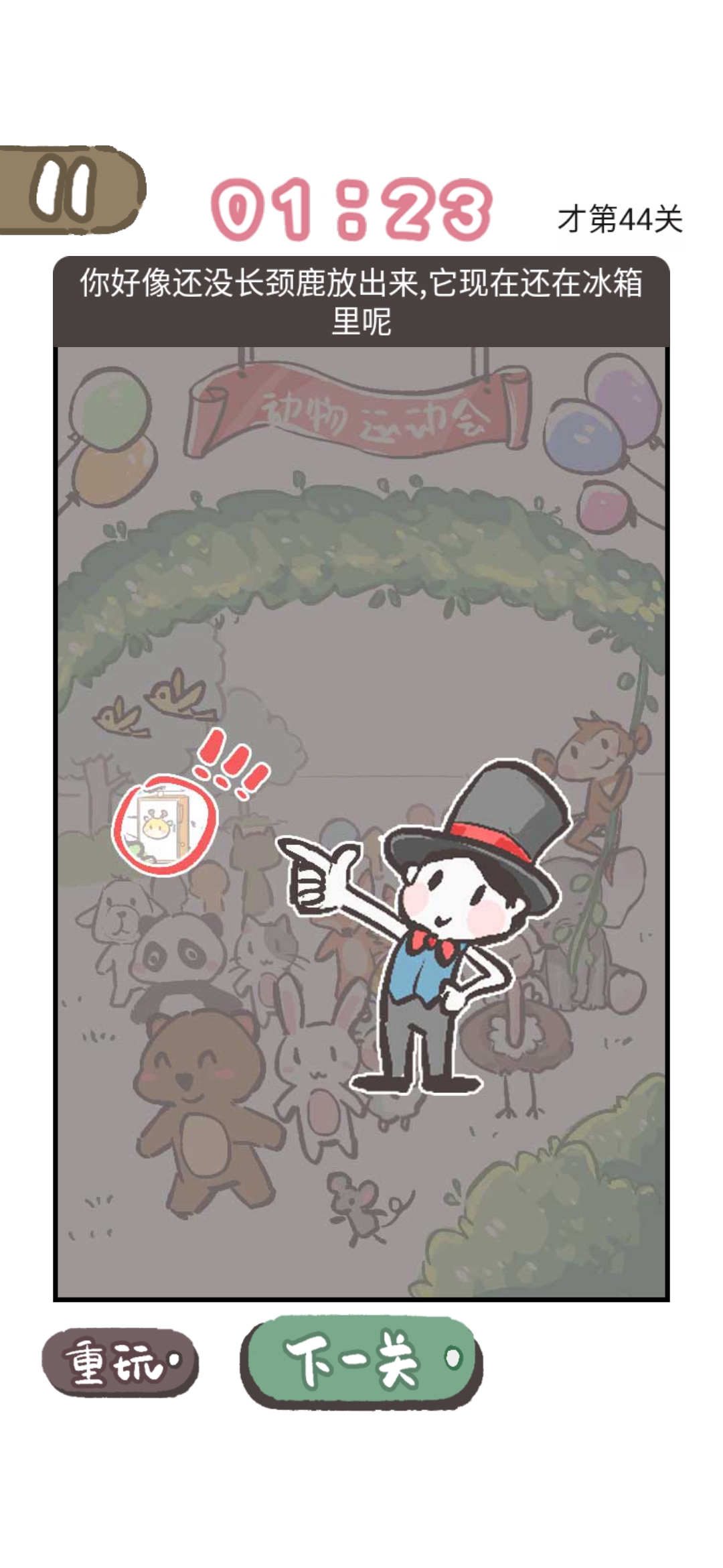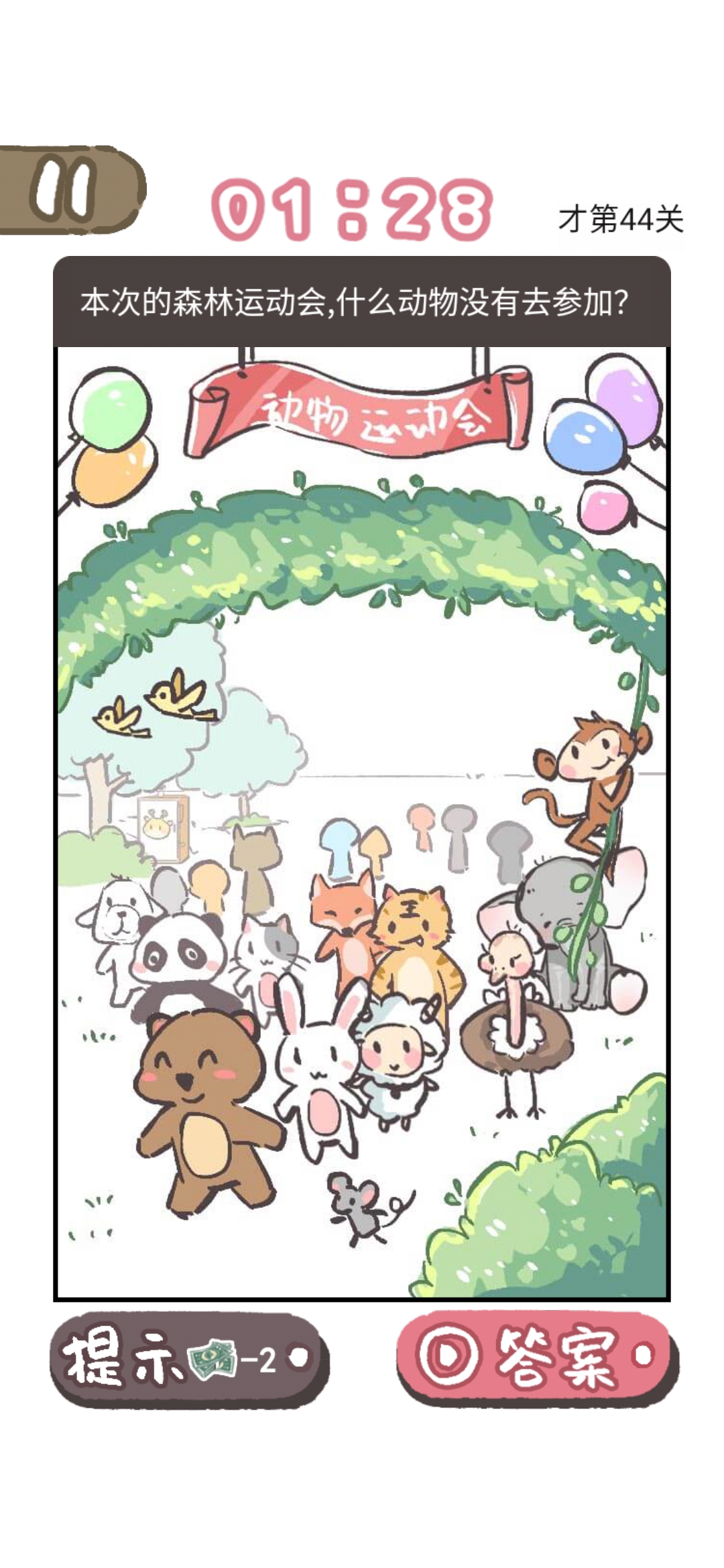 我太难了老铁是一款网络用语改编的大脑洞手游,在游戏中玩家会遇到许多的谜题,这些谜题的答案跟生活紧密相连,不仅要脑洞够大,思路清晰,还要知道需要梗,也能够考验玩家的细心程度,超多有趣的游戏关卡等你来挑战,带你感受游戏的畅快体验,那么我太难了老铁第44关怎么过?下面小编就为大家带来本次的森林运动会什么动物没有去参加快速通关攻略一览,有需要的小伙伴赶紧去游戏中试试吧。