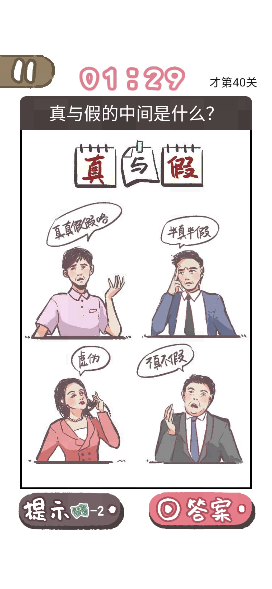 我太难了老铁是一款网络用语改编的大脑洞手游,在游戏中玩家会遇到许多的谜题,这些谜题的答案跟生活紧密相连,不仅要脑洞够大,思路清晰,还要知道需要梗,也能够考验玩家的细心程度,超多有趣的游戏关卡等你来挑战,带你感受游戏的畅快体验,那么我太难了老铁第40关怎么过?那么下面就给大家带来真与假的中间是什么快速通关攻略一览,感兴趣的玩家朋友们千万不要错过。