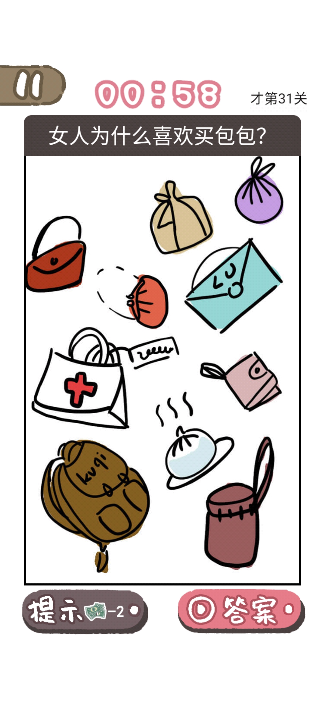 我太难了老铁是一款网络用语改编的大脑洞手游,在游戏中玩家会遇到许多的谜题,这些谜题的答案跟生活紧密相连,不仅要脑洞够大,思路清晰,还要知道需要梗,也能够考验玩家的细心程度,超多有趣的游戏关卡等你来挑战,带你感受游戏的畅快体验,那么我太难了老铁第31关怎么过?那么下面就给大家带来女人为什么喜欢买包包快速通关攻略一览,感兴趣的玩家朋友们千万不要错过。