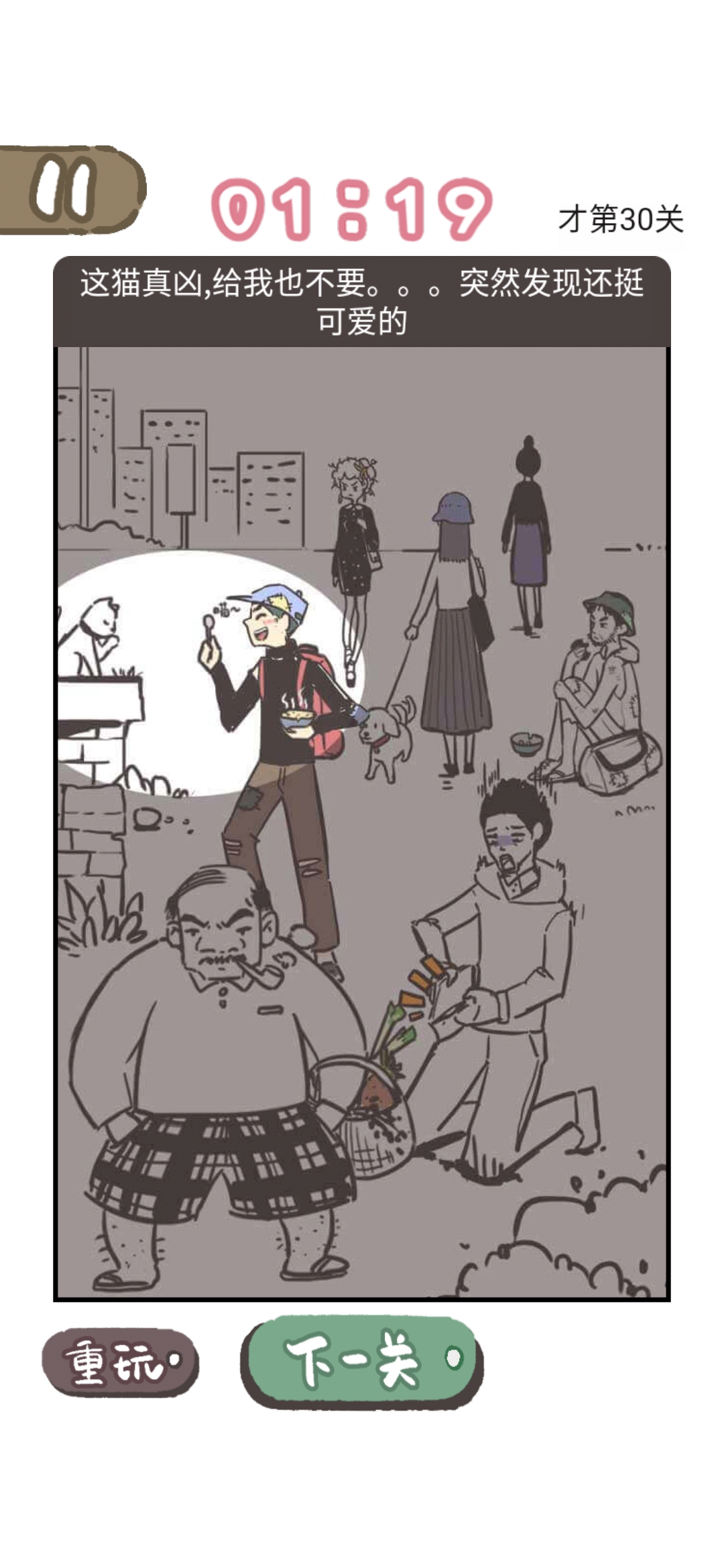 在游戏时间内,找出画面中正确答案就通关,和别的热门休闲游戏一样,画风简约,超狗血剧情,玩法新颖,很多都是热门的网络梗考验你的智商。碰到难关时可以通过点击屏幕获取道具,使用道具提示能快速通过,有些关卡还需要玩有趣的小游戏来通关,老少皆宜锻炼你的大脑,快带上你的小伙伴一起来体验吧