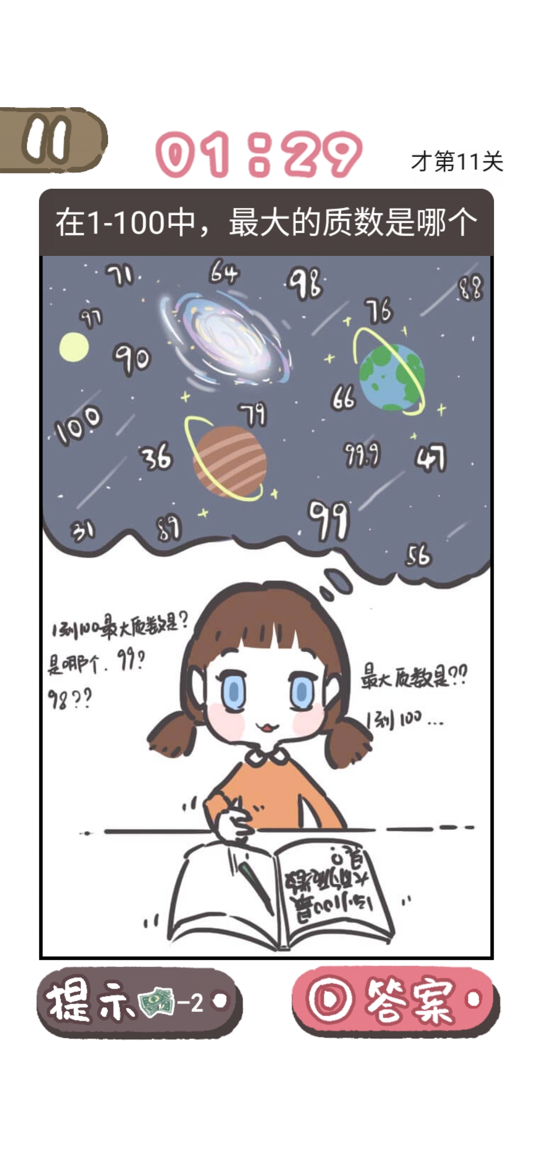 我太难了老铁是一款网络用语改编的大脑洞手游,在游戏中玩家会遇到许多的谜题,这些谜题的答案跟生活紧密相连,不仅要脑洞够大,思路清晰,还要知道需要梗,也能够考验玩家的细心程度,超多有趣的游戏关卡等你来挑战,带你感受游戏的畅快体验,那么我太难了老铁第11关怎么过?快和小编一起来看看这篇在1~100中最大的质数是哪个快速通关攻略一览,相信看完大家对我太难了老铁会有新的认识。
