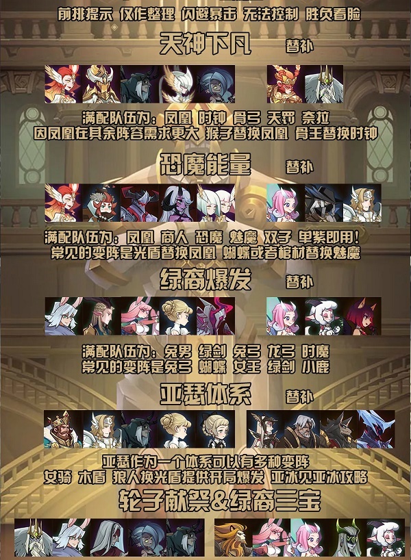 绿三宝搭配任意输出+任意坦克,至于光三宝不是不强,反倒是因为光三宝强被拆到其他各种队伍去导致光三宝很难凑齐在一队中。