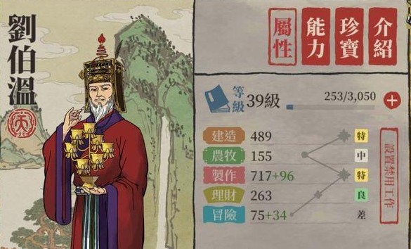 这个角色的天赋在制造上很有用,能够立刻完成百分之十的进度,而且还能减少一位工人,算是董夫人的升级版吧,各方面属性比李白要低那么一点,玩家们平时给他安排建造有关的工作就可以了。