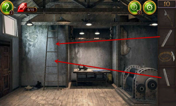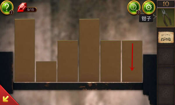1、进入第10关游戏之后我们首先拾取场景里比较明显的物品:左侧门下的钳子,楼梯下的铁棍,工作台上的皮带。然后点击右侧仪器。