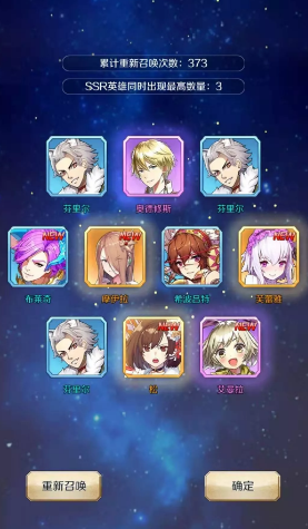官方良心的送上首次十连抽无限刷新机制,所以尽可能在这次抽到3~4个以上的ssr,方便起步。3个ssr人品好的话,50左右可以出(艾拉测试),悲剧一点抽了300+次(笔者亲测)。想要4个的同学,自行考虑手指能否承受高强度的连续点击。