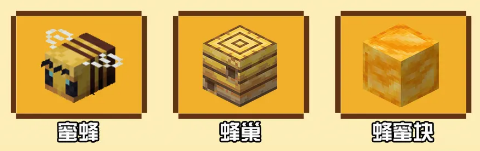 蜂蜜块:用4个蜂蜜瓶合成,合成与蛋糕同理,有着降低移动速度、掉落速度与跳跃能力,无伤摔落,粘着玩家,连接方块等功能。