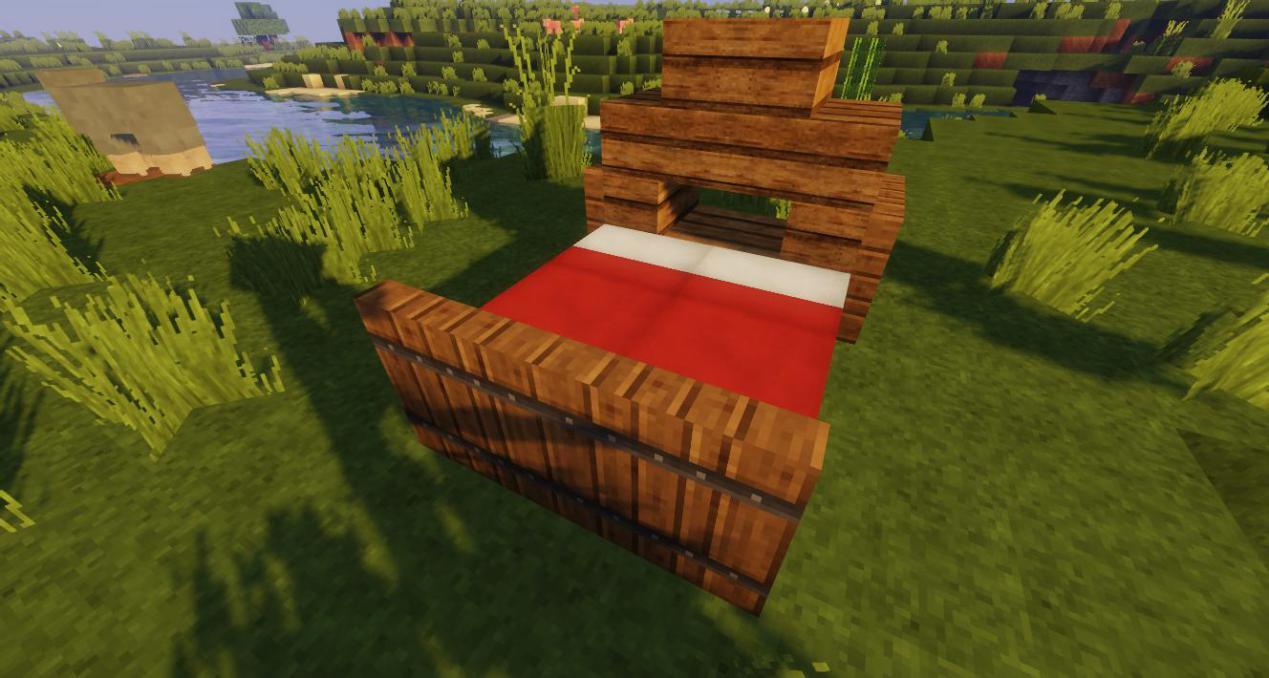 开局两张红色床,云杉木楼梯做床头,在两边加上云杉木活板门做出层次感,最后用云杉木活板门补上床尾,就完成啦!