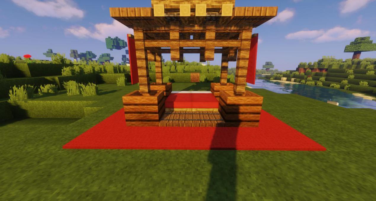 3.补上云杉木栅栏,再用红色旗帜和红色羊毛做装饰,就完成了!