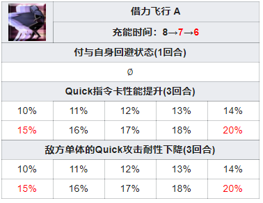 赋予自身回避状态(1回合);自身Quick指令卡性能提升10%~20%(3回合);