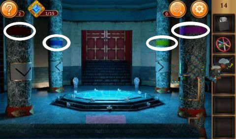 5、然后根据每根石柱上彩条的颜色调整转盘,左下:红、左上:蓝、右上:黄、右下:紫。