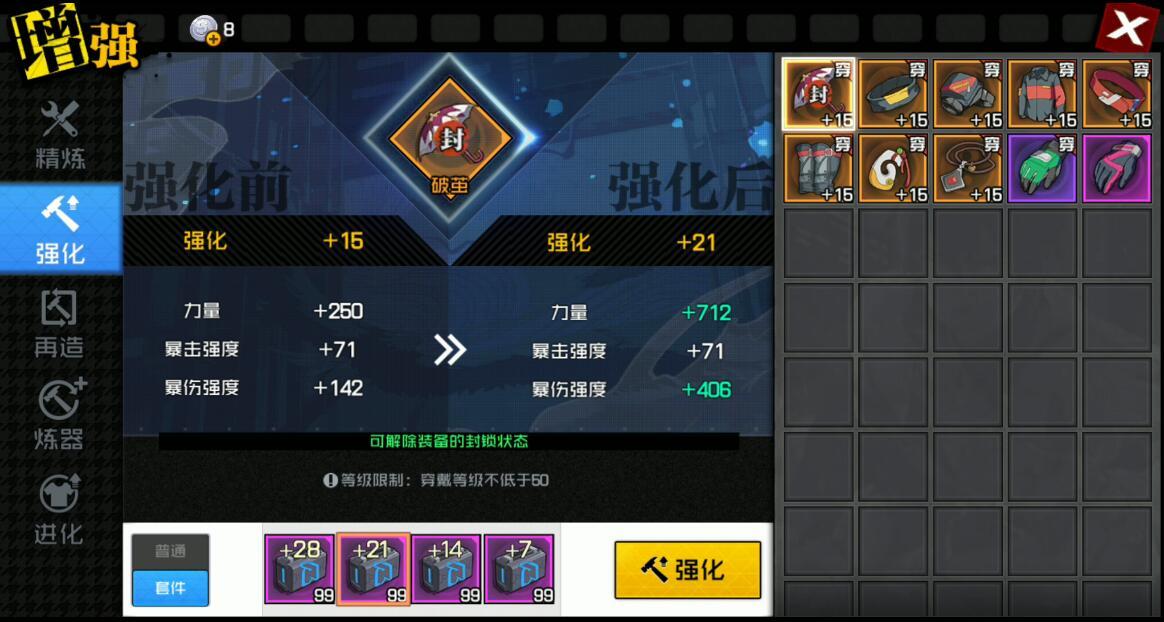 随着各位玩家装备等级不断提升,每次普通强化成功的概率也会逐渐降低,当装备+15后,强化失败后就会进入封锁模式,只有使用强化套件才能将其解锁。因此到了游戏后期阶段,100%概率提升装备等级的套件强化是不可缺少的重要道具。