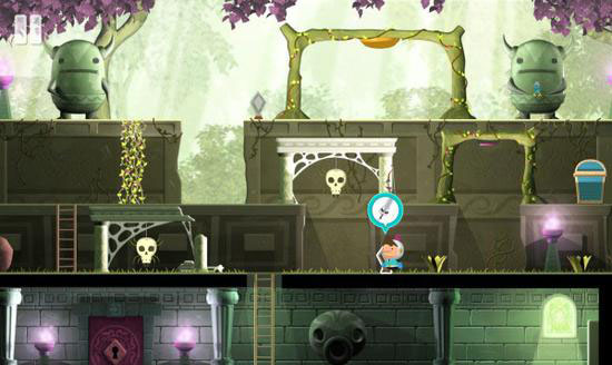 获得铁剑后,便能利用它将第二层的水晶激活,随后第三层的延伸平台机关便会打开。通过延伸平台便能获得弓箭工具。