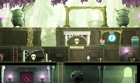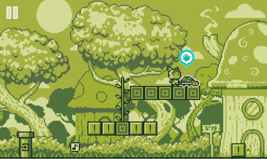进入游戏后,一股浓浓的马里奥风格就出现了,这时先控制主角走到第三块感叹号方块下进行点击,便会激活一条藤蔓。随后顺着藤蔓爬到第三层平台,然后点击乌龟将其拾取。