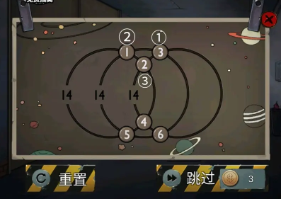 点击箭头来到右边,观察左边木门,通过调整数字键的位置使圆圈上的数字之和为14 ,按下图调整即可。