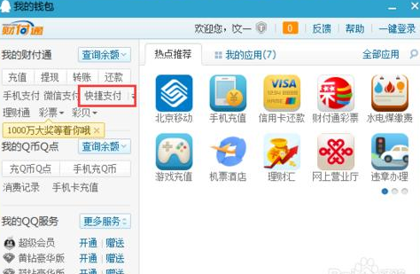 2、然后在我的钱包里面找到我的财付通,再在里面选择“快捷支付”;
