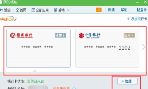 3、然后就会跳转到快捷支付管理的界面,在该界面上你可以添加银行卡或者是点击下面的管理,就如修改银行卡的解除绑定。