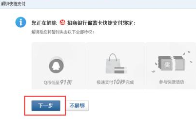 5、点击解绑,就会弹出一个提示界面,提示你正在解除快捷支付的银行卡,一方面也是防止解除错误银行卡,确认无误点击“下一步”。