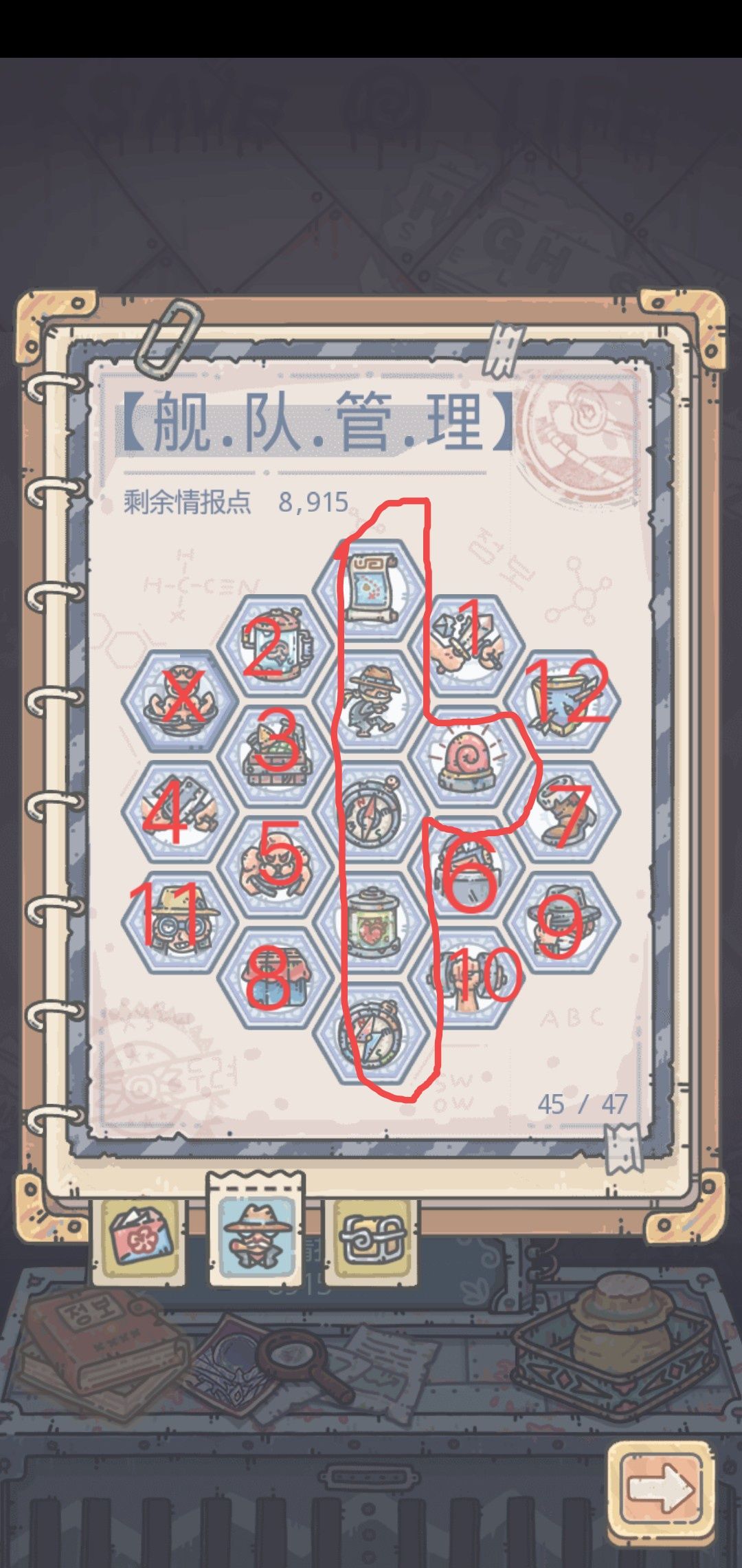 这幅图里打叉的两个对整体的探索毫无意义。剩下的按顺序就可以了。没有标记的就是那种给资源的对探索没有什么意义,想先学就先学不想先学就晚点也可以。