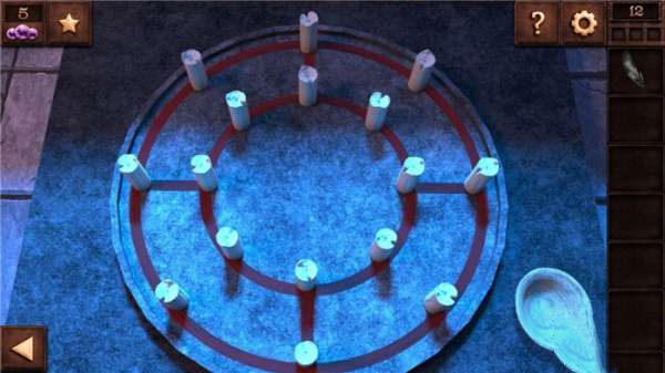 8、蜡烛的位置,先是外侧点燃四个,顺序是左右上下;然后是内侧从最上面的那个顺时针点一圈,就可以打开地窖的门并且通过第十二关。