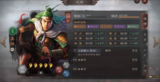 因为姜维的枪兵属性是A,所以不建议做主将。可以把姜维看作是奶枪阵容中刘备的替代品,虽然少了刘备的回复,但是换来的是姜维的稳定输出和降低敌方属性。