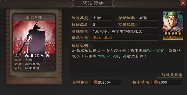 看起来是挺适合姜维的,发动一次可造成2000左右的伤害,但是对比一下同样发动几率的【横扫千军】就能看出,这个战法比较一般,即便是武力智力双高的人使用也难以打出爆炸伤害,武智不均衡的武将用起来伤害就更低了,况且横扫千军还附带一个30%概率的震慑效果。
