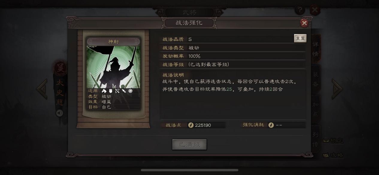 太史慈的自带战法奠定了他在游戏中不可替代的地位,每回合攻击两次的bug设定,让其在游戏中变得独一无二,同时对突击战法的适配程度,达到了满分。值得注意的是每次攻击降低目标统率25点,是单次独立计算回合的,并不会重置回合数。