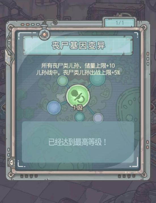 中间格丧尸基因变异会增加丧尸类儿孙的储量上限+10,且儿孙战中丧尸类儿孙出战上限+5%。