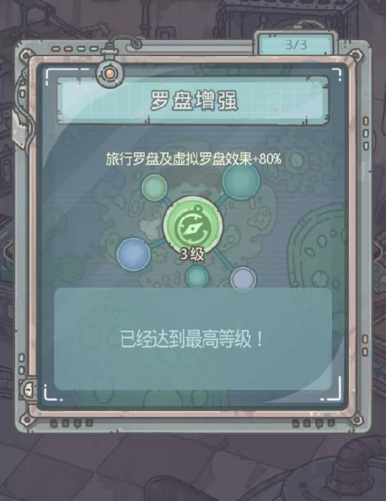 中间格为罗盘增强,共可以研究三次,研究会增强旅行和虚拟罗盘效果40%/60%/80%。