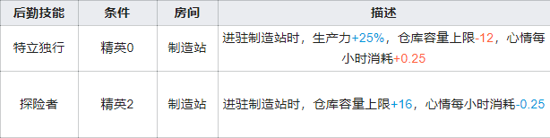 进驻制造站时,生产力+25%,仓库容量上限-12,心情每小时消耗+0.25。