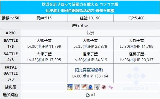 以上就是FGO复刻从者夏日庆典轻量版沙洲在沙滩上来回奔跑锻炼活动力孜孜不倦级攻略的全部内容了,快快收藏游戏爱好者查看更多FGO游戏资讯攻略。