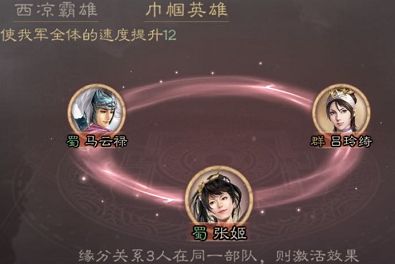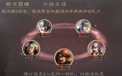 西凉霸雄:这个缘分提供的全体前两回合必中十分适合菜刀队。建议要组的话,用马超+马云禄+马腾,有会心有必中,再视情况加上虎踞鹰扬,可以说十分暴力。