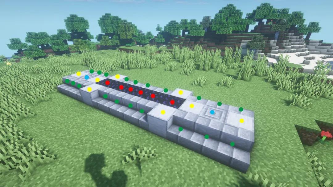 在红点处放置六块黑曜石;在黄点处放置共八块平滑石头;在绿点处放置共二十块石砖楼梯;在蓝点处放置两块錾制石砖;