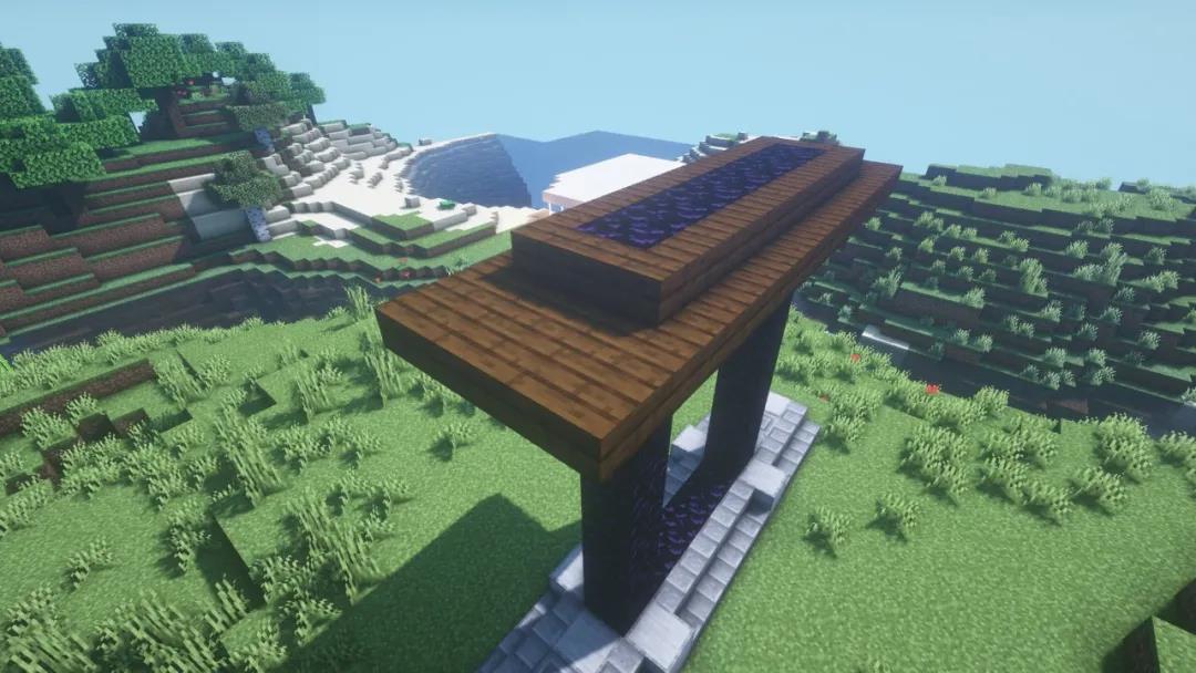 接着向上立起两条高八格的黑曜石柱,在顶端再用四块黑曜石封顶,做出下界传送门的框架。